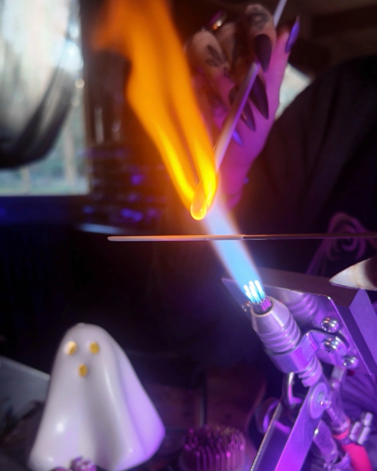 Each charm is built slowly, layer by layer, with details like spots, swirls, petals, or leaves added while the glass is still molten. The finished charm is then placed into a kiln to be annealed — a process of controlled cooling that strengthens the glass and ensures it will last for generations.