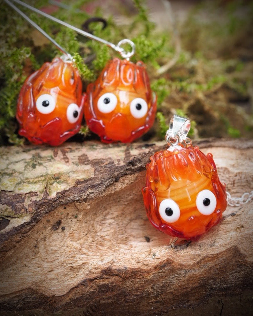 Carry a little flame of magic wherever you go. The Ember Spirit Necklace features a hand-sculpted glass charm, inspired by Calcifer from the Studio Ghibli classics. Each fiery spirit is carefully shaped in molten glass, with vibrant orange and red tones that flicker with life and wide, mischievous eyes that can’t help but make you smile.