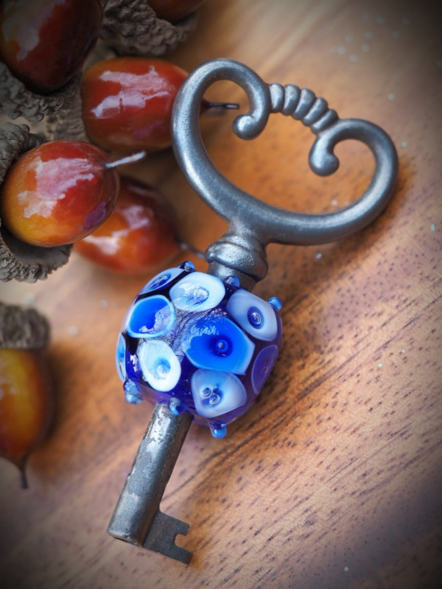 A one of a kind Santa key featuring a large, hand-sculpted glass bead swirling with deep blues, icy whites and shimmering plunged bubbles. The bead has the look of a hidden lagoon at midnight, lit only by moonlight and winter stars. Every raised detail and bubble is shaped in the flame, giving it a rich, textured, almost otherworldly glow. The vintage key beneath adds that perfect touch of timeless, weathered charm.